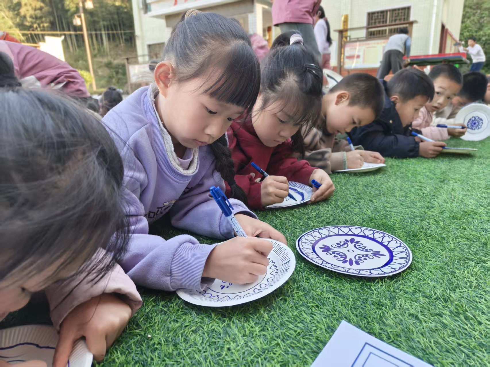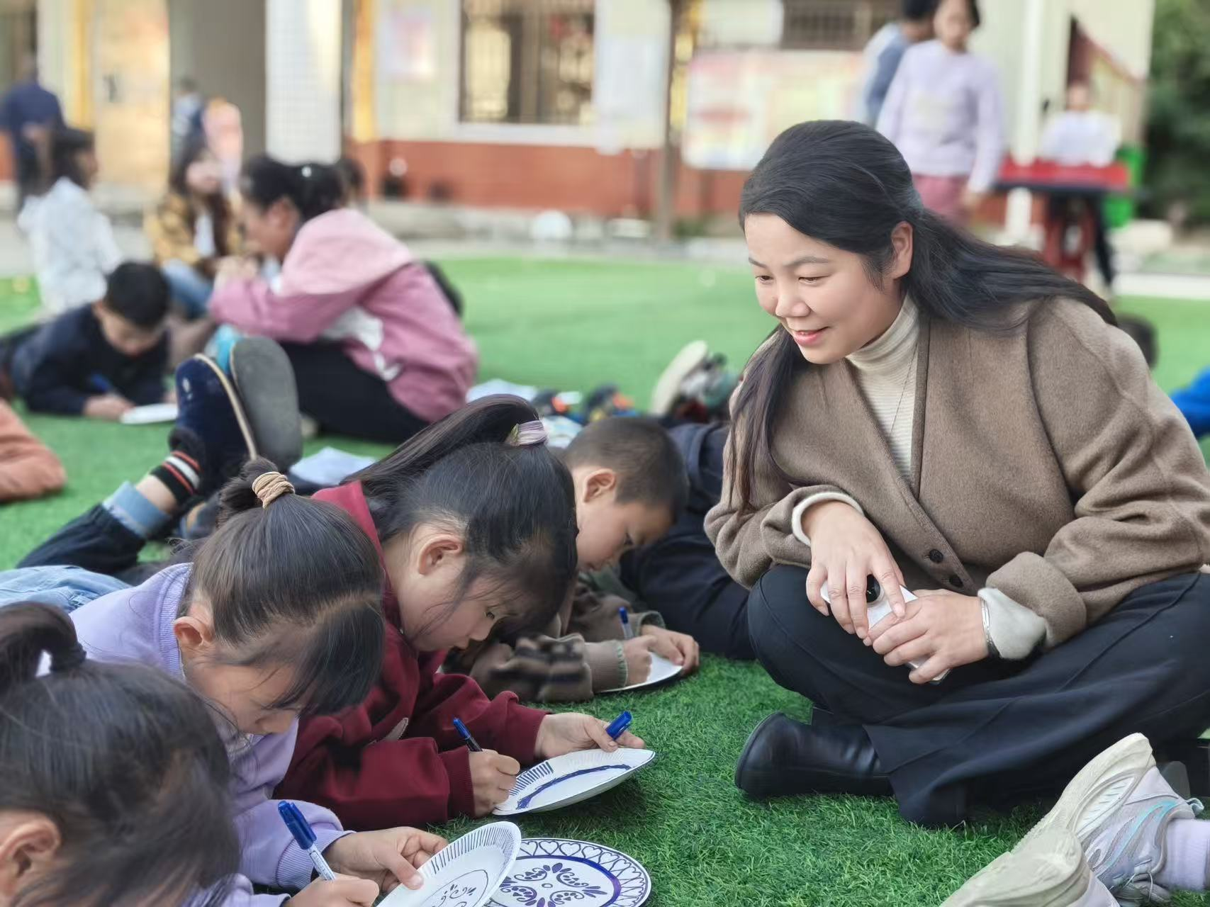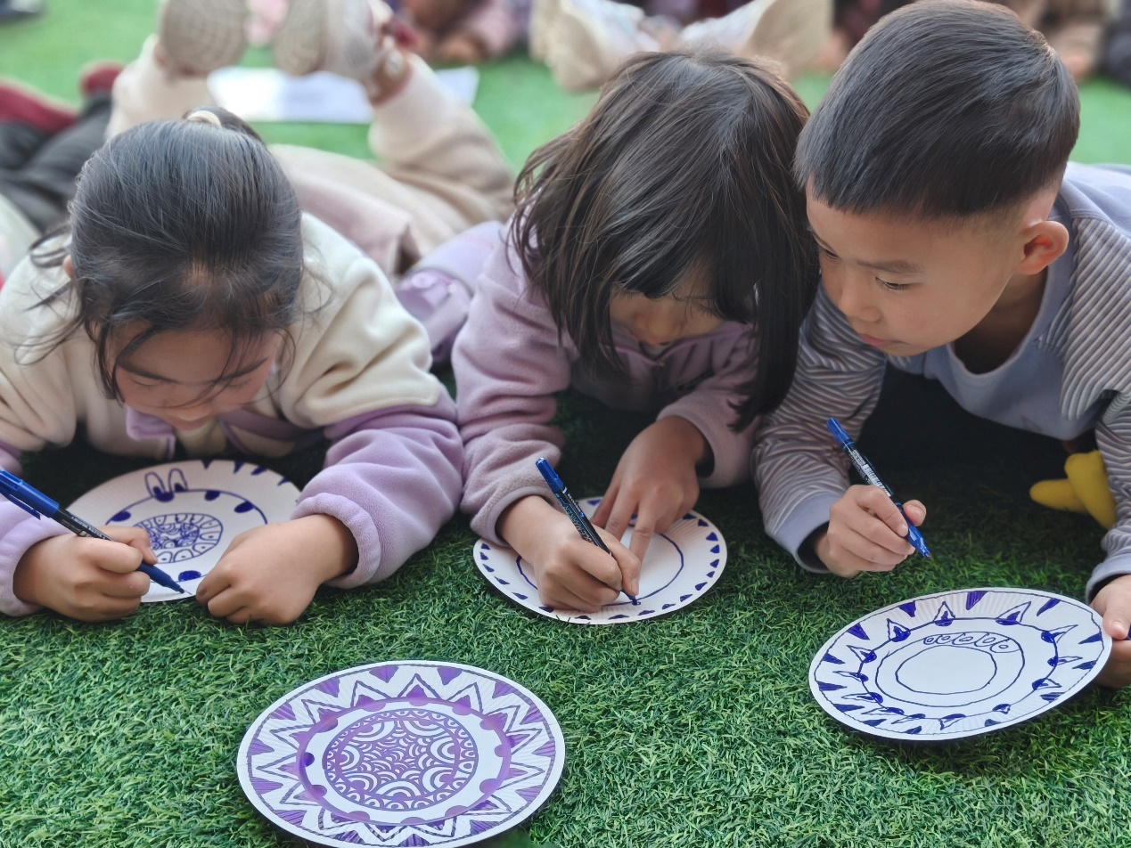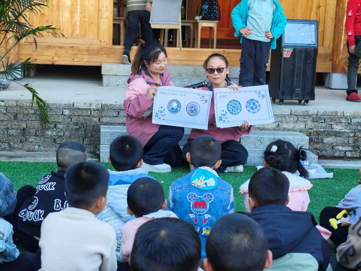 活动现场,幼儿园教师团队以“神秘青花宝物”为引,带着孩子们赏青花、识纹样,用长线、短线、波浪线等简单元素,引导孩子们创作出属于自己的青花瓷盘。学校驻古楼村第一书记王艳和学校幼儿园园长徐志华走进创作现场,与孩子们一同欣赏作品、分享创作灵感,温柔的鼓励让乡野间的创作氛围愈发热烈。村民们表示,这样的活动非常有意义,欢迎支教团队常来。